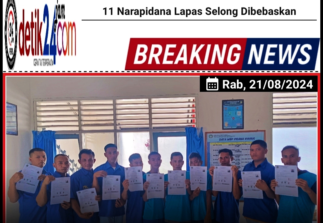 Pada hari ini 11 orang narapidana dikeluarkan setelah menerima perbaikan surat Keputusan Menteri Hukum dan HAM RI tentang Pembebasan Bersyarat dan Cuti Bersyarat karena pengurangan masa pidana (remisi) yang didapatkan pada HUT Kemerdekaan RI Ke-79 Tahun 2024 dengan Nomor : PAS-1706,1707. PK.05.09 Tahun 2024 tentang Pembebasan Bersyarat dan Cuti Bersyarat.