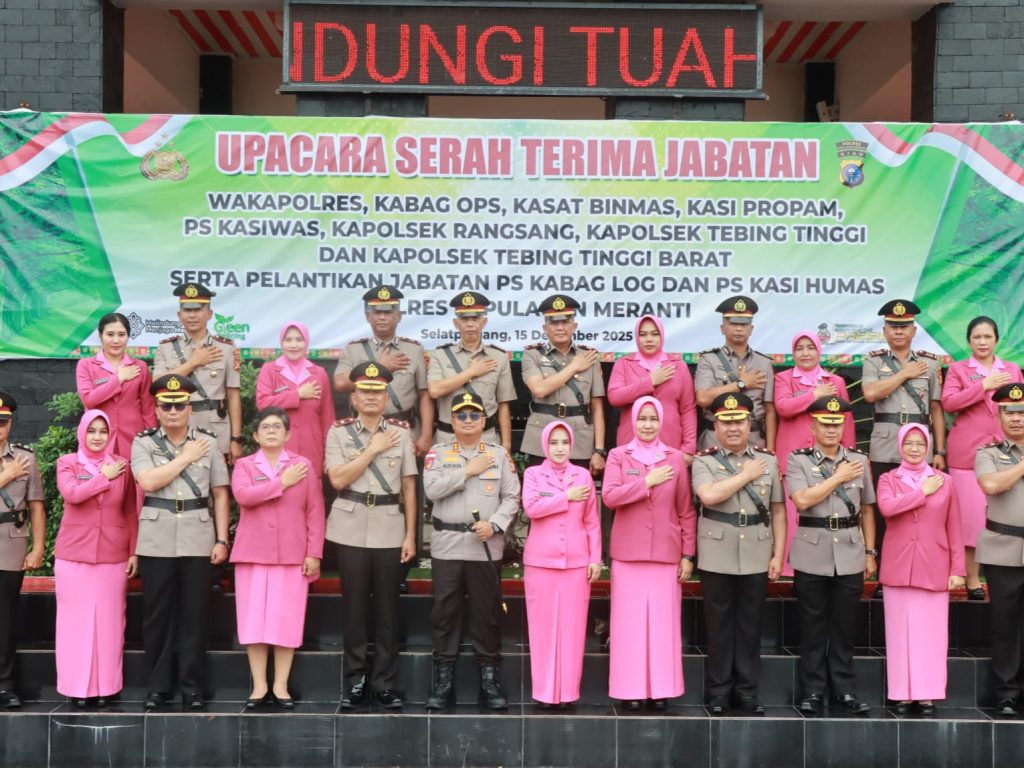 detik24jam. Meranti,- Polres Kepulauan Meranti Polda Riau Kembali melakukan mutasi pejabat dengan mengelar Upacara Serah Terima Jabatan Wakapolres, Kabag Ops, Kasat Binmas, Kasi Propam, Ps Kasiwas, Kapolsek Rangsang, Kapolsek Tebing Tinggi Dan Kapolsek Tebing Tinggi Barat Serta Pelantikan Jabatan Ps Kabag Log Dan Ps Kasi Humas di Lingkungan Polres Kepulauan Meranti di Halaman Mapolres Kepulauan Meranti Senin (15/12/2025).