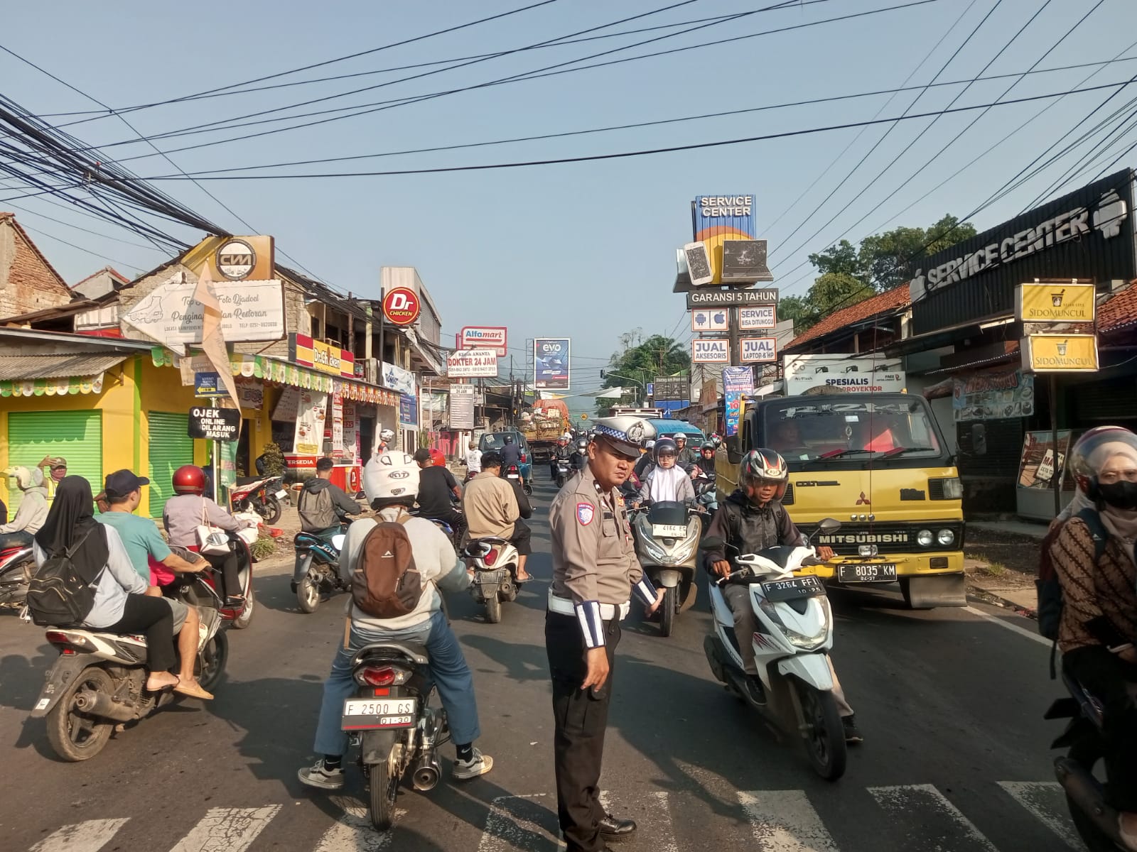 Anggota Lantas Polsek Ciampea Polres Bogor membantu masyarakat melakukan pengaturan lalu lintas di titik titik rawan kemacetan serta petugas juga melakukan pengaturan terhadap anak-anak yang menyebrang menuju sekolah.