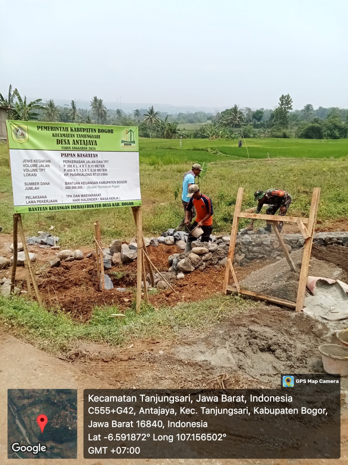 Detik24jam.com – Tanjungsari Botim| Jaga kondusifitas lapangan saat realisasi pembangunan Tembok penahan tanah (TPT) dan pengerasan jalan dilingkungan Desa Antajaya Koptu Frezon Paliyama monitoring kegiatan bersama pemdes.