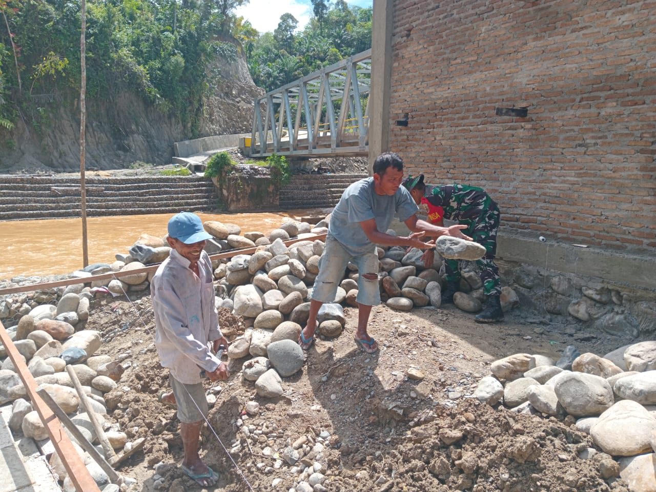 Tapteng_Babinsa Koramil 02/Sorkam, Serda Rudson Aritonang berbaur melaksanakan karya bhakti membantu mengangkat batu untuk pandasi rumah milik warga binaannya. Bertempat di desa Simargarap. Kecamatan Pasaribu Tobing, Kabupaten Tapanuli Tengah.