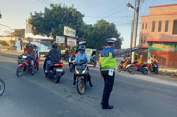 Personil Sat Lantas Polres Batu Bara melakukan pengaturan lalu lintas di beberapa titik strategis di…