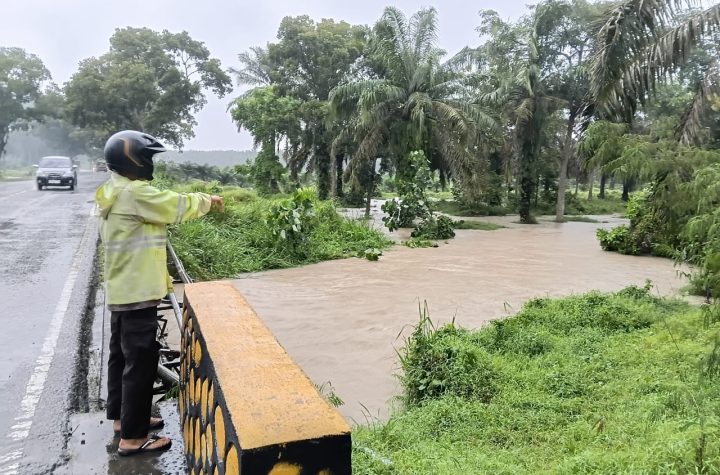Personil Polsek Lima Puluh, AIPDA SARWEDI, melakukan pengecekan lokasi banjir di Dsn 1 dan 2…