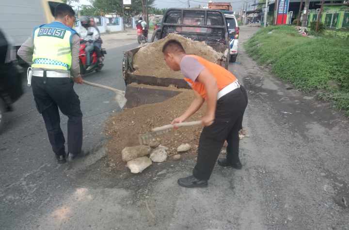 Sat Lantas Polres Batu Bara melaksanakan kegiatan penimbunan jalan berlubang di jalinsum km 100-101 desa…