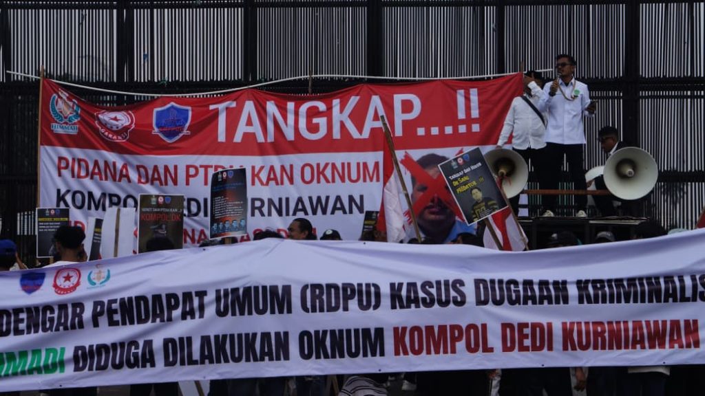 Terlihat massa membawa berbagai atribut unjuk rasa berupa baliho dan spanduk besar yang memuat tuntutan: “Tangkap, Periksa, dan PTDH-kan Oknum Kompol Dedi Kurniawan Diduga Pelaku Kriminalisasi dan Rekayasa Hukum Kasus Rahmadi”.