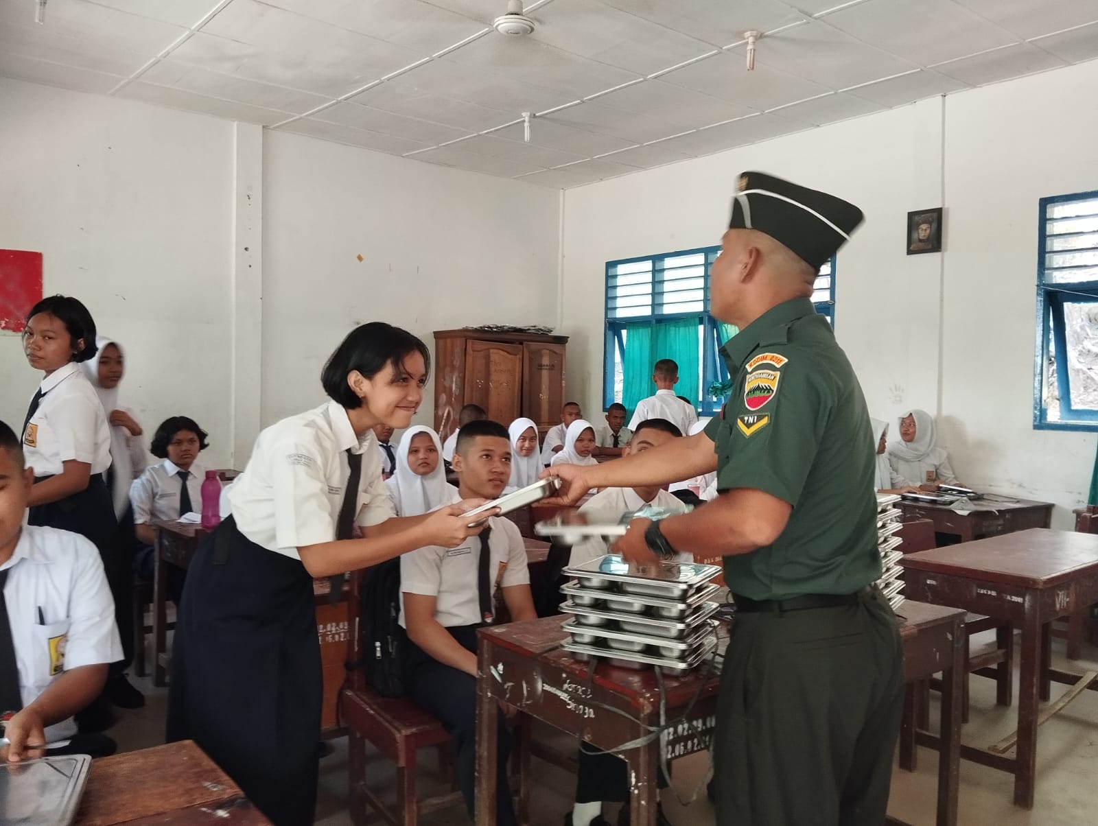 Tapteng – Babinsa Koramil 03/Pandan Kodim 0211/TT mendukung dalam Program Makan bergizi untuk Anak Sekolah seperti yang dilakukan Serda Al Amin Pasaribu dalam pendampingan makan bergizi di SMP N 1 Pandan Kelurahan Pandan Wangi Kecamatan Pandan Kabupaten Tapanuli Tengah, Senin, (21/04/2025)