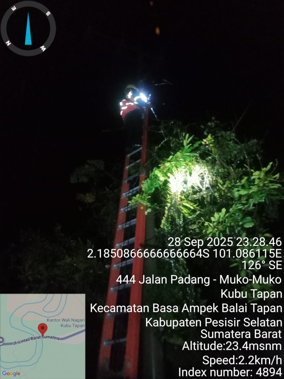 “Pohon kelapa tumbang akibat hujan dan angin kencang yang menyebabkan kabel PLN putus, kita langsung kontak petugas PLN Tapan dan alhamdulillah cuma beberapa menit petugas langsung datang dan memperbaiki kabel yang putus”, jelasnya.(Al)