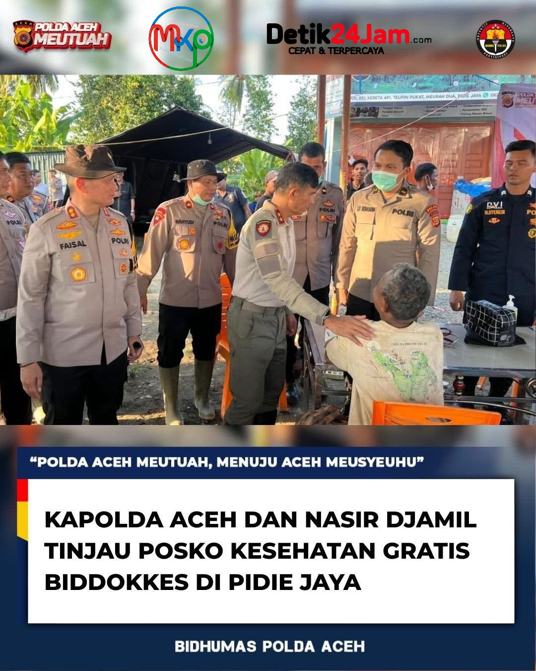 Kapolda Aceh, Irjen Pol. Marzuki Ali Basyah, bersama Anggota Komisi III DPR RI, Muhammad Nasir Djamil, melakukan peninjauan ke posko layanan kesehatan gratis yang digelar oleh Subbiddokpol Biddokkes Polda Aceh di Desa Teupin Pukat, Kecamatan Meurah Dua, Kabupaten Pidie Jaya, Sabtu (29/11/2025). Posko ini bertujuan untuk memberikan layanan kesehatan darurat kepada masyarakat yang terdampak banjir.