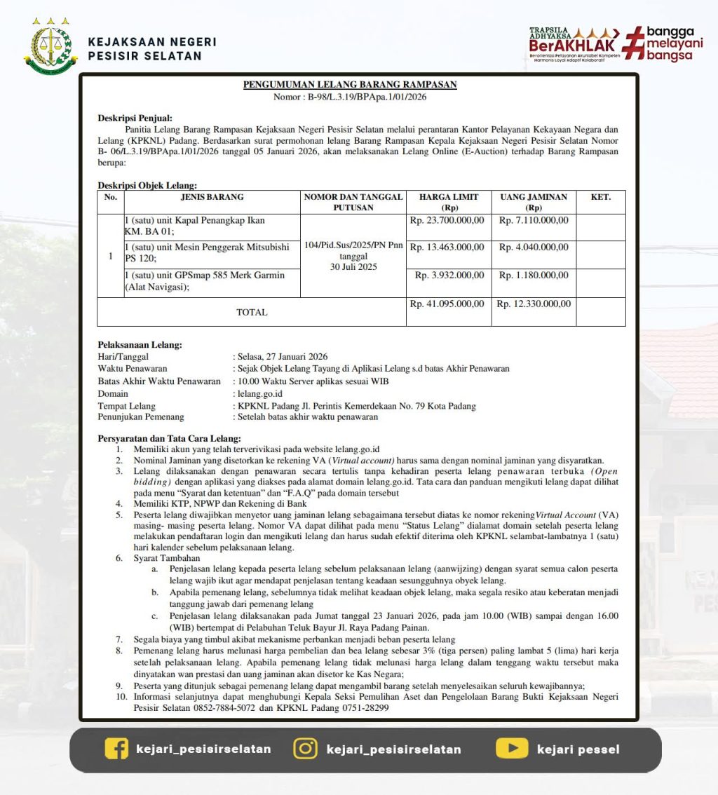Terhadap Barang Rampasan, berdasarkan Surat Permohonan Lelang Barang Rampasan Kepala Kejaksaan Negeri Pesisir Selatan.Pengumuman:B.99/L.3.19/BPApa.1/01/2026.