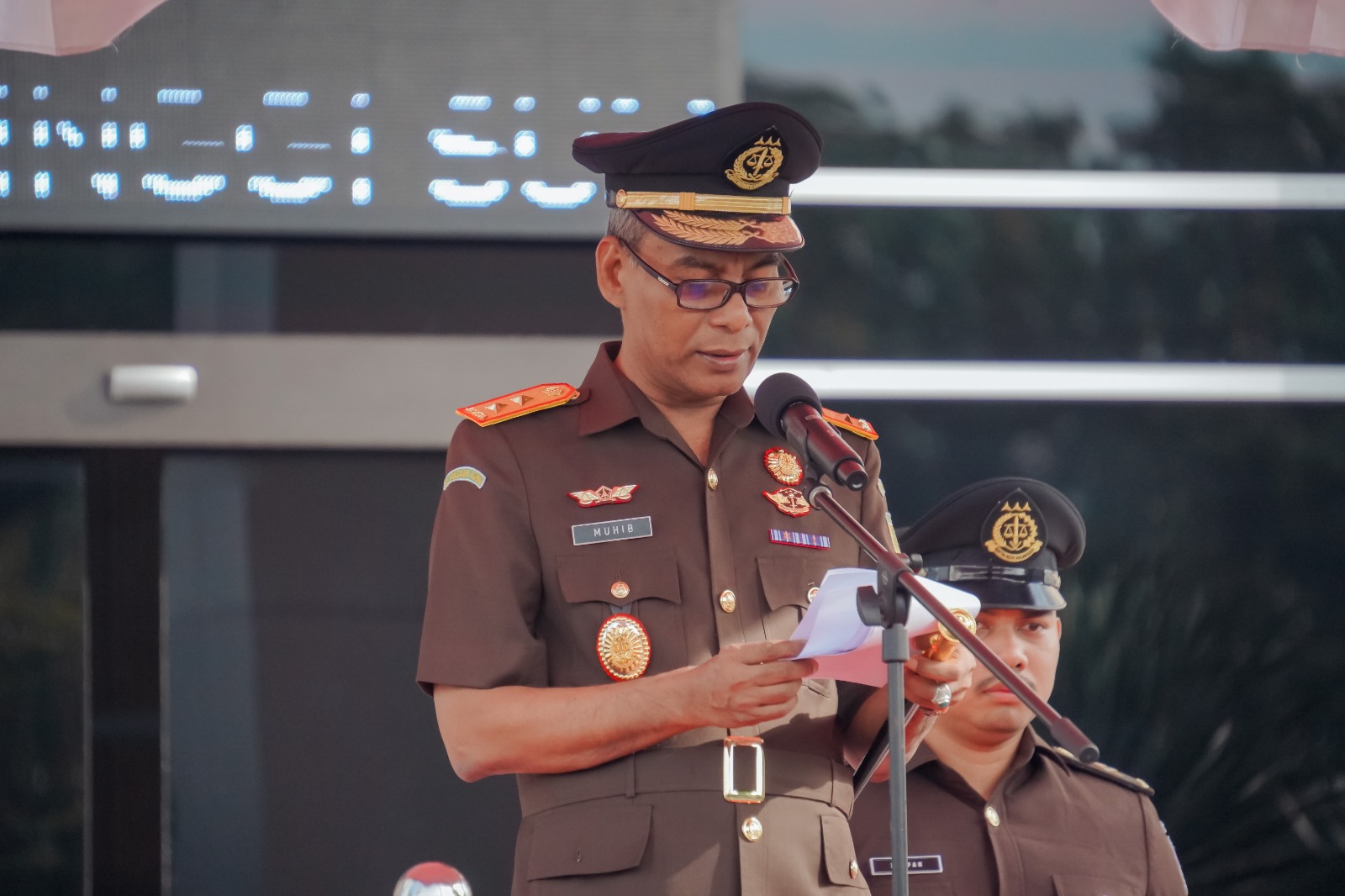 Kepala Kejaksaan Tinggi (Kajati) Sumbar, Muhibuddin,S.H.,M.H bertindak sebagai inspektur upacara. Dalam kesempatan tersebut, beliau membacakan pidato tertulis dari Jaksa Agung (JA) RI.