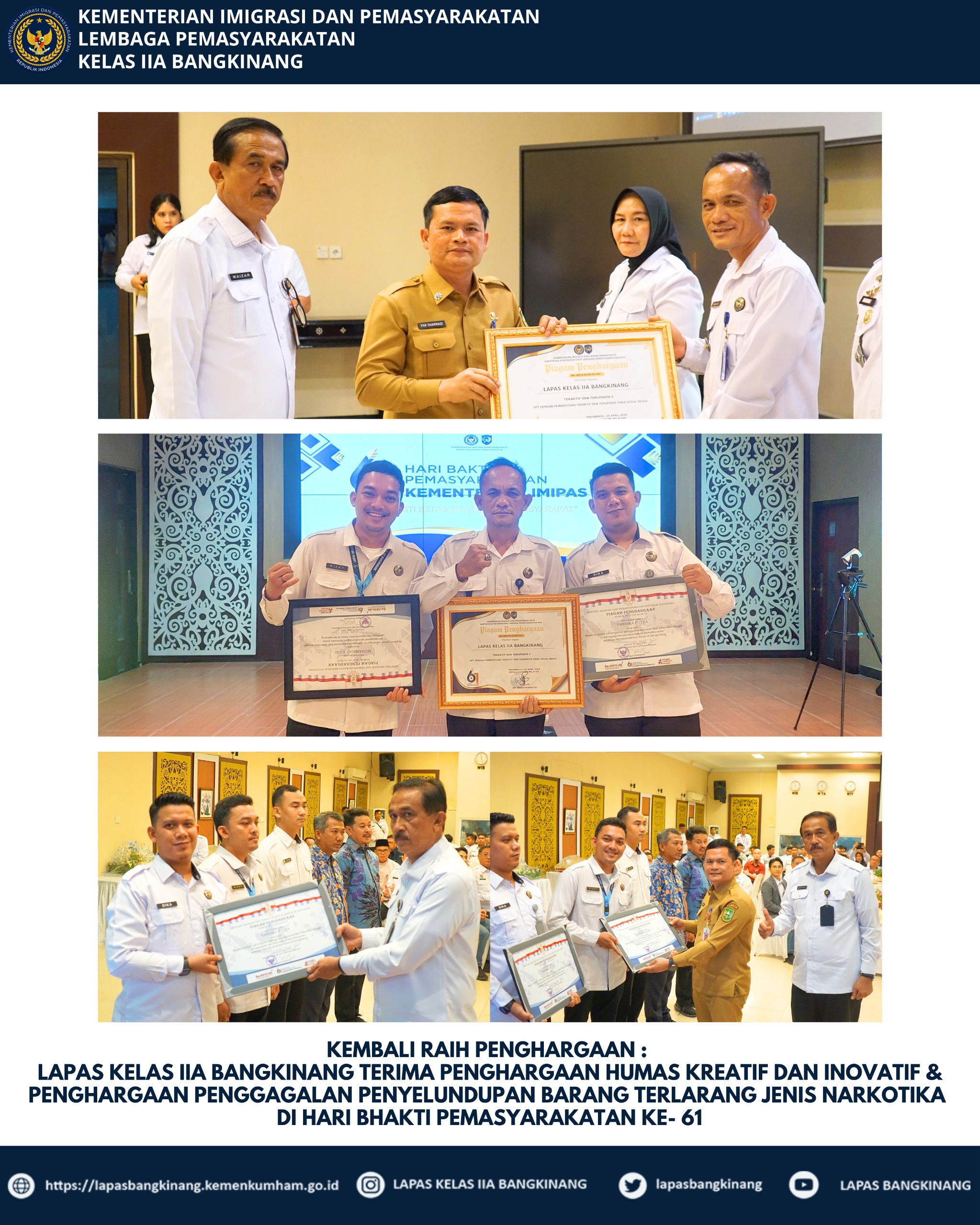Dalam momentum yang membanggakan ini, Lapas Kelas IIA Bangkinang telah berhasil meraih penghargaan sebagai UPT dengan Pengelolaan Humas yang Kreatif dan Inovatif di Media Sosial dan 2 Pegawai Lapas Bangkinang, anggota regu pengamanan, Yandika Putra dan Muhammad Rizki juga mendapatkan penghargaan langsung oleh Menteri Imigrasi dan Pemasyarakatan Republik Indonesia, Bapak Agus Andrianto atas aksi heroik nya menggagalkan penyelundupan jenis narkotika melalui bola kasti yang dilempar dari Luar tembok Lapas.