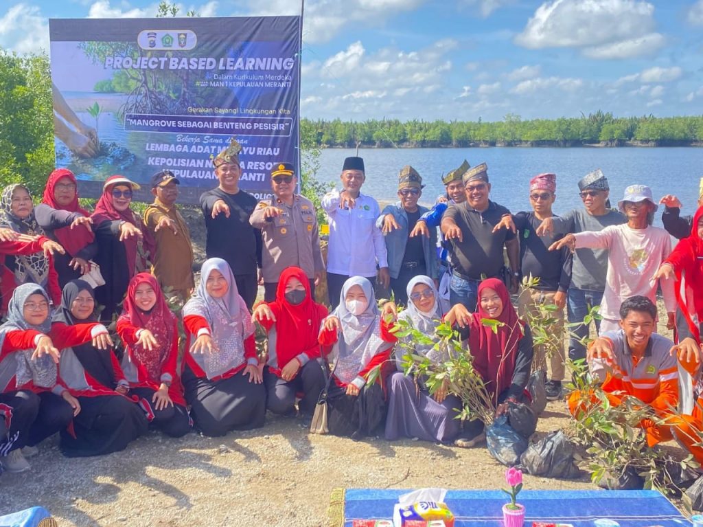 detik24jam. Meranti – Secara berkolaborasi Madrasah Aliyah Negeri 1 Kepulauan Meranti (MAN Sakti), Lembaga Adat Melayu Riau (LAMR), dan Polres Kepulauan Meranti melakukan reboisasi tanaman mangrove di tepian pantai, jalan baru, Desa Sesap, Kecamatan Tebing Tinggi, Selasa (14/10/2025).