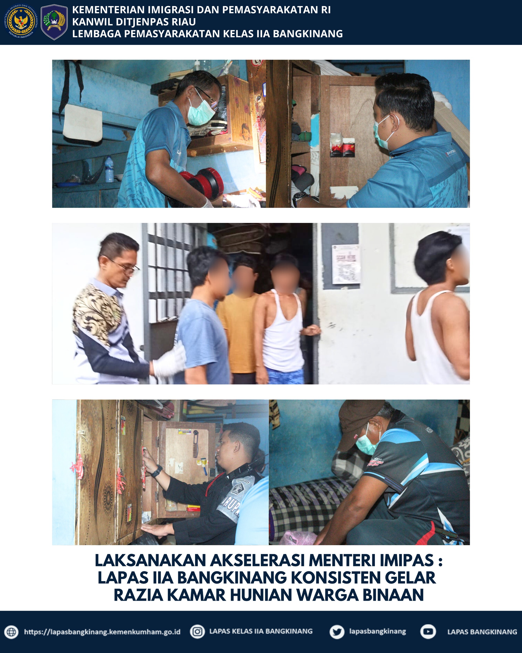 “Lapas IIA Bangkinang terus melakukan Antisipasi dan meningkatkan keamanan dalam rangka menciptakan suasana kondusif dan membangun pembinaan yang maksimal bagi warga binaan. Kegiatan ini sebagai upaya dan tindak lanjut dalam menjalankan arahan Menteri Imigrasi dan Pemasyarakatan, Bapak Agus andrianto. Kami akan terus melakukan kegiatan razia berkala seperti ini rutin sebanyak 4 kali dalam seminggu. untuk mencegah segala bentuk pelanggaran dan gangguan keamanan di dalam Lapas. Ini adalah komitmen kami dalam mewujudkan organisasi yang bersih dan terbebas dari penyalahgunaan dan peredaran gelap narkoba dan barang-barang terlarang lainnya di lingkungan Lapas,” Tegas Alexander.