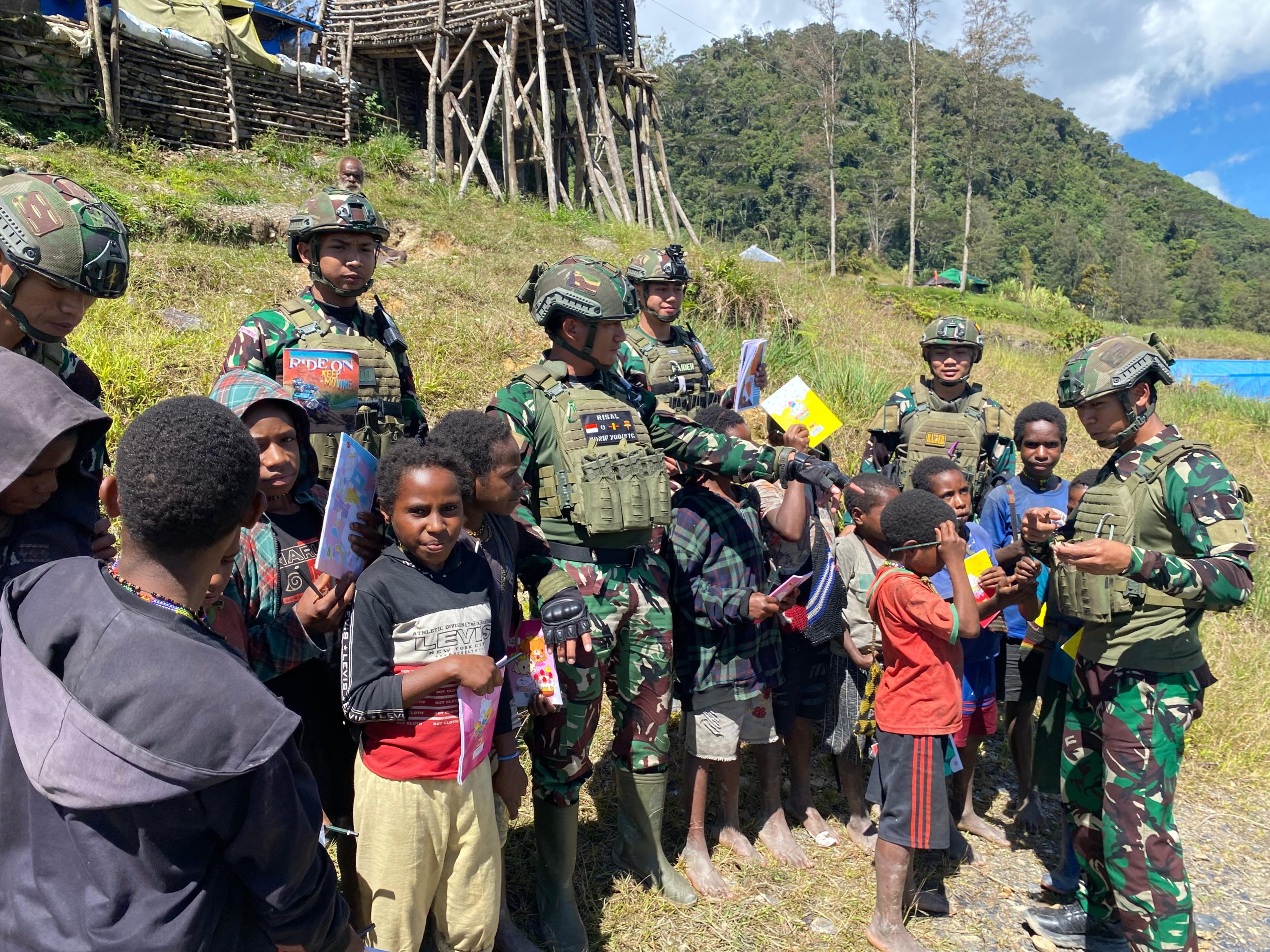 Puncak, Papua — Di antara hamparan hijau Pegunungan Tengah dan langit biru yang luas, sekelompok prajurit dengan seragam loreng bukan hanya membawa senjata, tapi juga harapan.