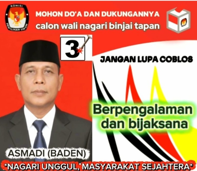 Detik24jam.com|Pessel-Menjelang Pemilihan Wali Nagari Binjai Tapan, calon Wali Nagari Asmadi atau yang akrab disapa Baden, memaparkan visi, misi, serta pandangan strategisnya tentang arah pembangunan Nagari Binjai ke depan. Ia menegaskan komitmen untuk membangun Nagari Binjai Tapan yang maju, mandiri, dan berkelanjutan, dengan menekankan keseimbangan antara pembangunan fisik dan mental,spiritual masyarakat.