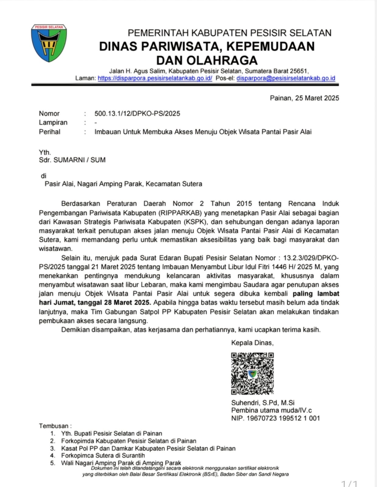 Selain itu, merujuk pada Surat Edaran Bupati Pesisir Selatan Nomor : 13.2.3/029/DPKO-PS/2025 tentang imbauan Menyambut Libur Idul Fitri 1446 Hijriyah/2025, yang menekankan pentingnya mendukung kelancaran aktivitas masyarakat, khususnya saat menyambut wisatawan saat libur lebaran, maka kaki menghimbau saudara, agar penutupan akses jalan menuju objek wisata Pantai Pasir Alai untuk segera dibuka kembali paling lambat hari Jum’at tanggal 28 Maret 2025. Apabila hingga batas waktu tersebut masih belum ada tindak lanjutnya. Maka Tim Gabungan Satpol-PP akan melakukan tindakan pembukaan akses secara langsung.