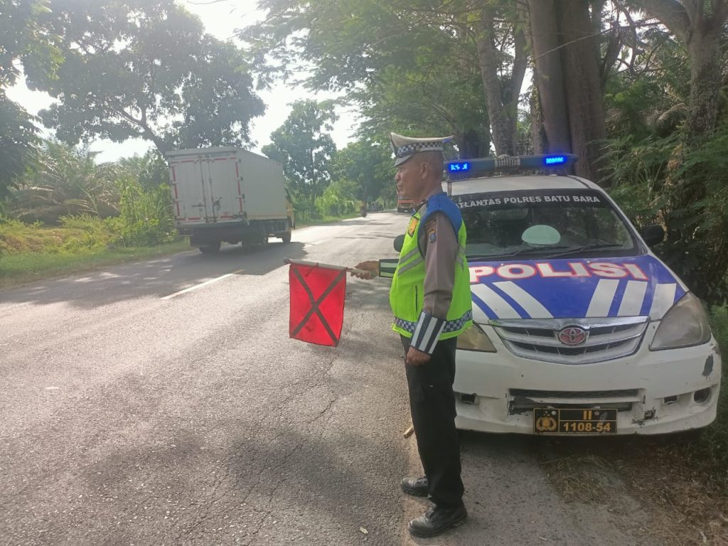 Sat Lantas Polres Batu Bara melaksanakan patroli dan mengibarkan bendera merah di lokasi rawan di Jalinsum Wilayah Pos Lantas Sei Bejangkar. Kegiatan ini dipimpin oleh Aiptu Sartono, Kapos Lantas, dan Aiptu A. Rajagukguk.