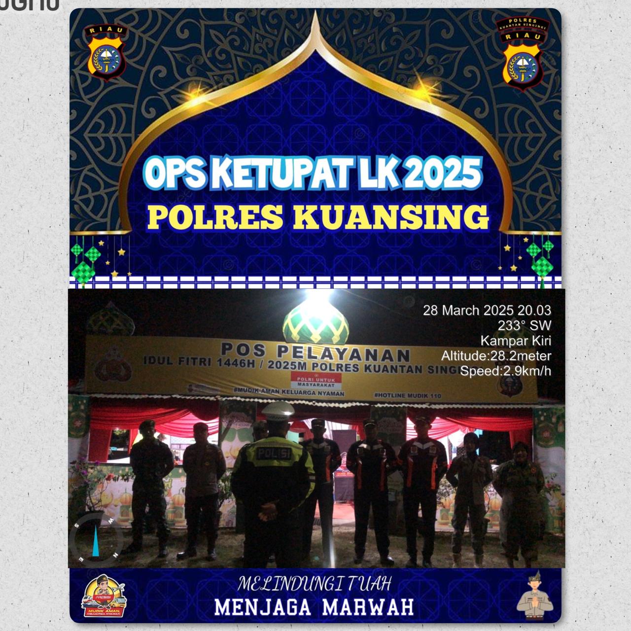 Kapolres Kuansing AKBP Angga F. Herlambang, S.I.K., S.H. melalui Ps. Kapolsek Singingi Hilir IPTU Alferdo Krisnata Kaban, S.H. menyampaikan Apel tersebut diikuti oleh personel gabungan dari berbagai instansi yang turut serta dalam pengamanan dan pelayanan di Pos PAM, dengan rincian sebagai berikut Polri: 10 personel, TNI: 1 personel, Dinas Kesehatan (Dinkes): 2 personel, Dinas Perhubungan (Dishub): 3 personel, Satuan Polisi Pamong Praja (Sat Pol PP): 2 personel, dan Badan Penanggulangan Bencana Daerah (BPBD).