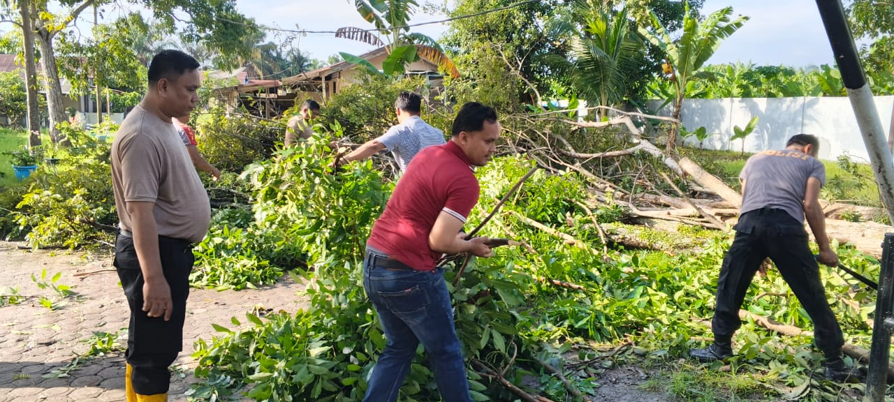 Personil Polsek Labuhan Ruku melaksanakan giat gotong royong membersihkan pohon tumbang yang mengakibatkan pagar dindang depan Mako Polsek Labuhan Ruku mengalami kerusakan, Sabtu (29/11/2025).