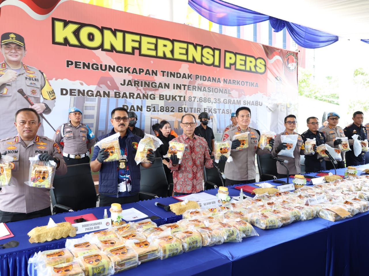 Polda Riau berhasil mengungkap jaringan narkotika internasional dengan barang bukti bukti 87,686 kg sabu dan 51.882 butir pil ekstasi.