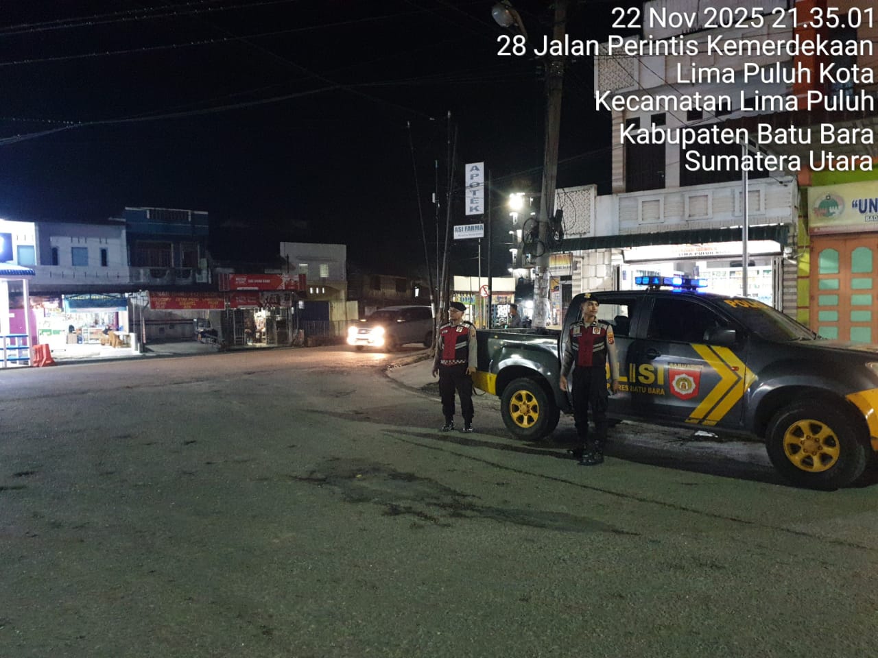Patroli roda-4 dilakukan di Jalan Lintas Sumatera Utara Simpang Lima Puluh Kota, Batu Bara, dengan memberikan himbauan kepada masyarakat untuk melaporkan jika melihat atau mengetahui adanya tindak pidana.