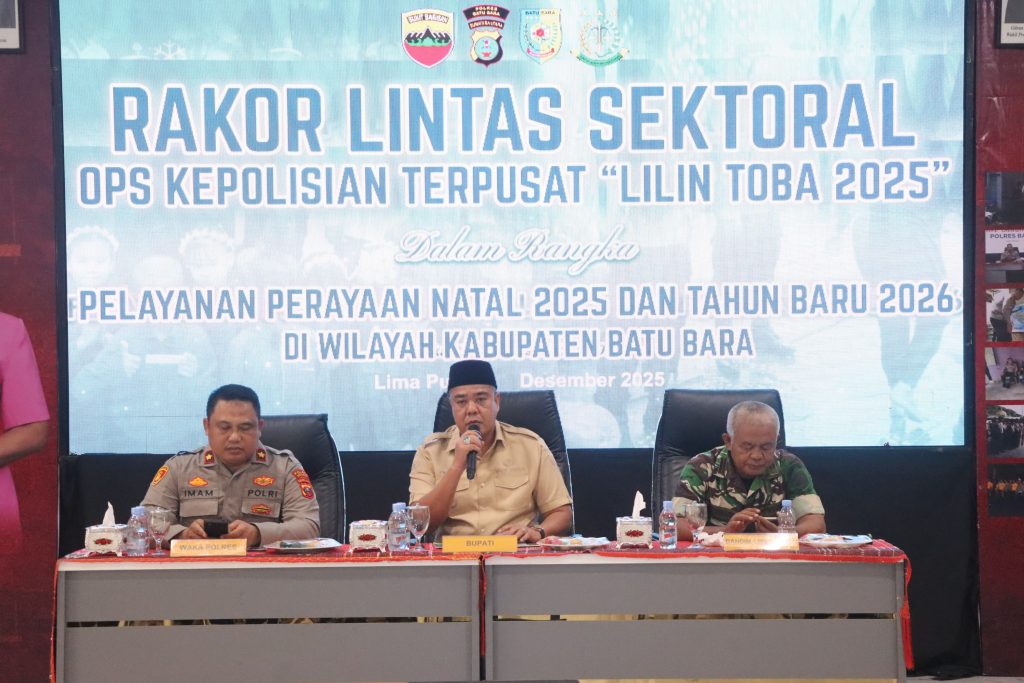 Polres Batu Bara melaksanakan Rapat Koordinasi Lintas Sektoral Operasi Kepolisian Terpusat Lilin Toba 2025 dalam rangka pelayanan perayaan Natal 2025 dan Tahun Baru 2026 di Wilayah Kabupaten Batu Bara, Jumat (19/12/2025) pukul 15.00 WIB.