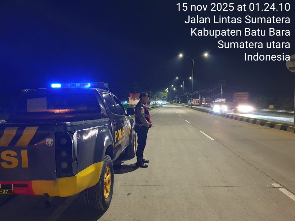 Personil Polres Batu Bara melaksanakan patroli kota presisi Blue Light Roda-4 guna mengantisipasi terjadinya 3C dan kejahatan lainnya di wilayah hukum Polres Batu Bara, Sabtu (15/11/2025) dini hari.