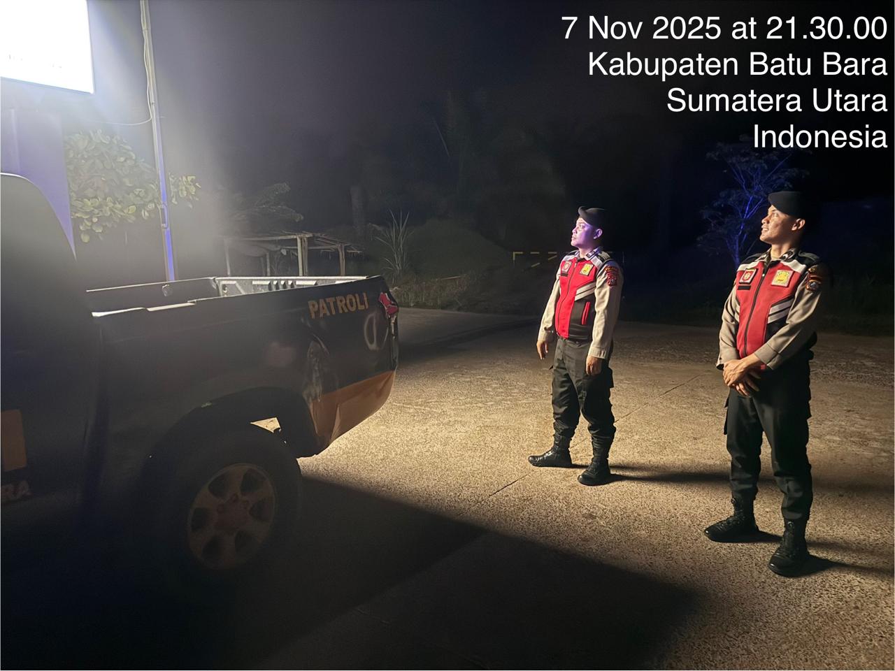 Personil Polres Batu Bara melaksanakan patroli roda-4 guna mengantisipasi terjadinya begal, balap liar, 3C, perjudian, prostitusi, dan kejahatan lainnya di wilayah hukum Polres Batu Bara, pada Jumat, 7 November 2025, pukul 21.30 WIB.