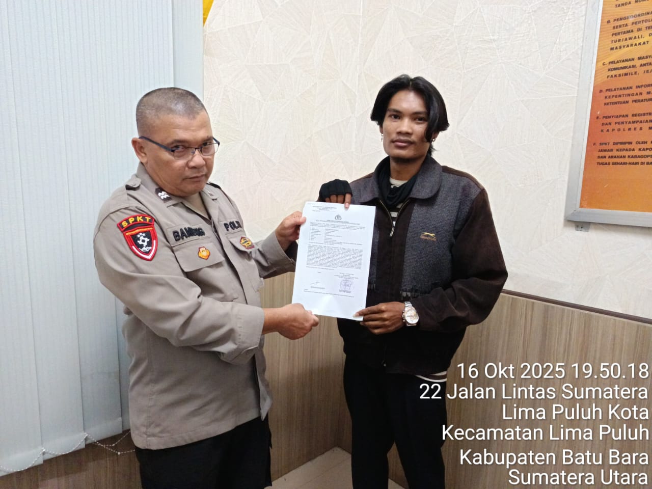 Piket SPKT Polres Batu Bara menerima laporan pengaduan dari pelapor an. Bobi Saputra Marbun terkait kasus dugaan pengancaman pada Kamis (16/10/2025) malam.