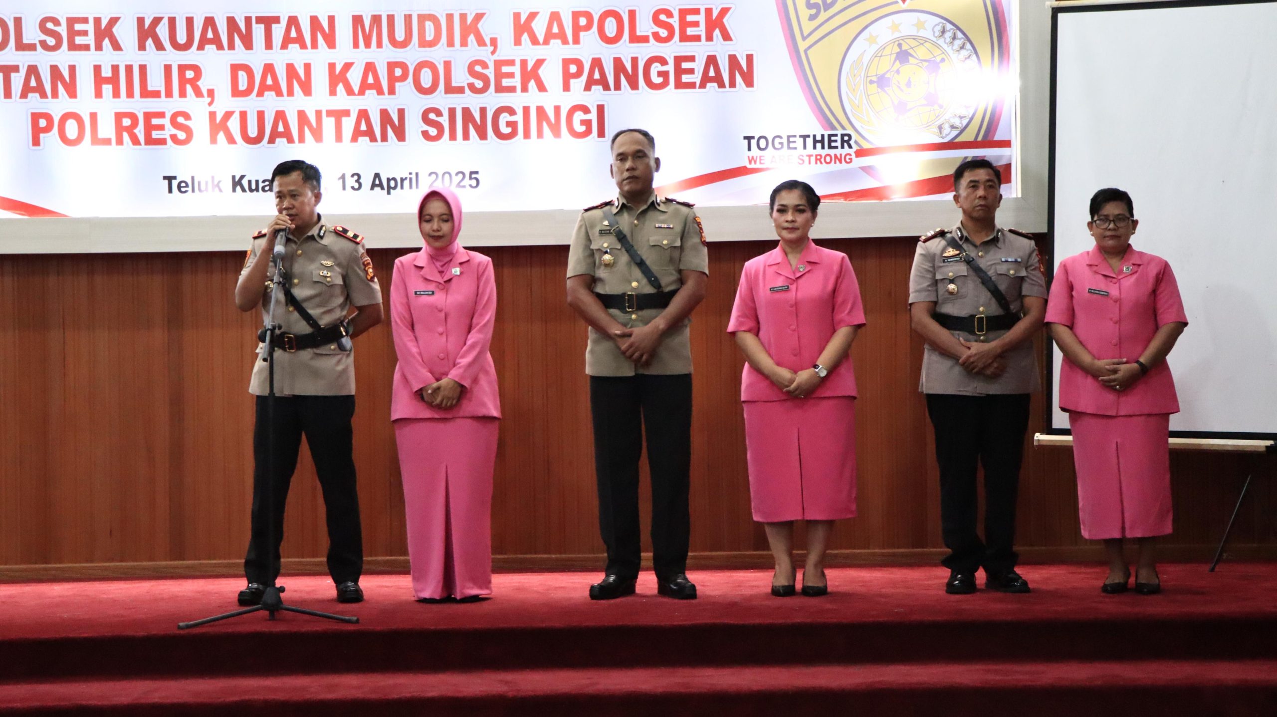 KUANTANSINGINGI,- Polres Kuantan Singingi (Kuansing) menggelar acara pisah sambut atau kenal pamit bagi tiga pejabat Kapolsek yang mengalami rotasi jabatan, yaitu Kapolsek Lubuk Jambi, Kapolsek Kuantan Hilir, dan Kapolsek Pangean. Kegiatan ini berlangsung pada Minggu sore, 13 April 2025, pukul 16.30 WIB di Aula Sanika Satyawada Mapolres Kuansing dengan penuh kehangatan dan kekeluargaan.