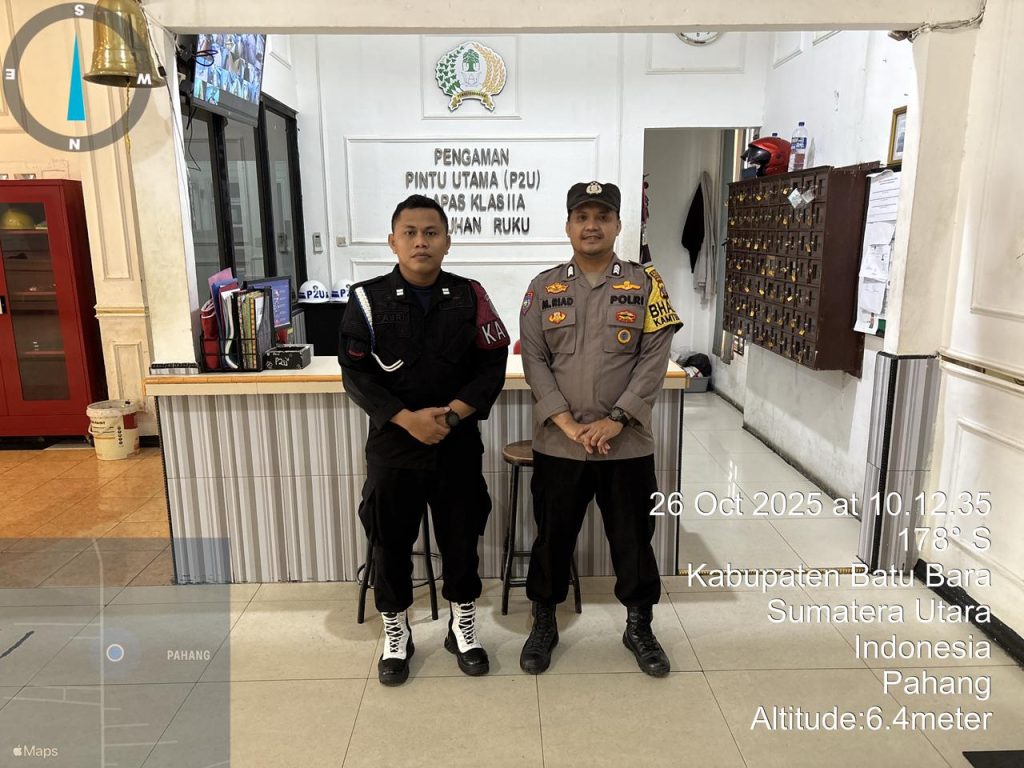 Personel Polsek Labuhan Ruku melaksanakan pengamanan di Lapas Klas IIA Labuhan Ruku untuk menciptakan situasi yang aman dan kondusif di wilayah hukum Polsek Labuhan Ruku. Kegiatan ini dilaksanakan pada Minggu (26/10/2025) pukul 09.00 WIB hingga selesai.