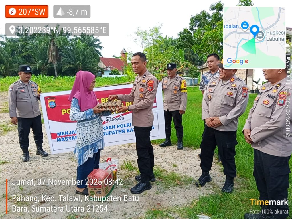 Kapolsek Labuhan Ruku, AKP Cecep Suhendra, beserta personil Polsek Labuhan Ruku, melaksanakan kegiatan Jumat Berkah dengan membagikan sembako kepada kaum dhuafa di Wilkum Polsek Labuhan Ruku, pada Jumat, 7 November 2025, pukul 08.41 WIB.