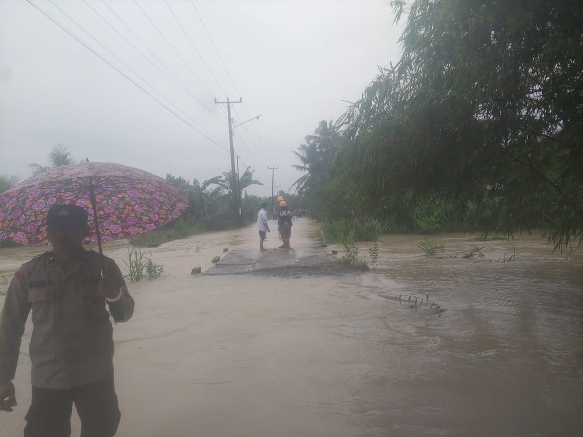Personil Polsek Medang Deras melakukan pengecekan lokasi banjir di wilayah hukum Polsek Medang Deras, terutama di Jalan Protokol Dusun Pinggir Sungai Desa Nanassiam, Jumat (28/11/2025) pagi.