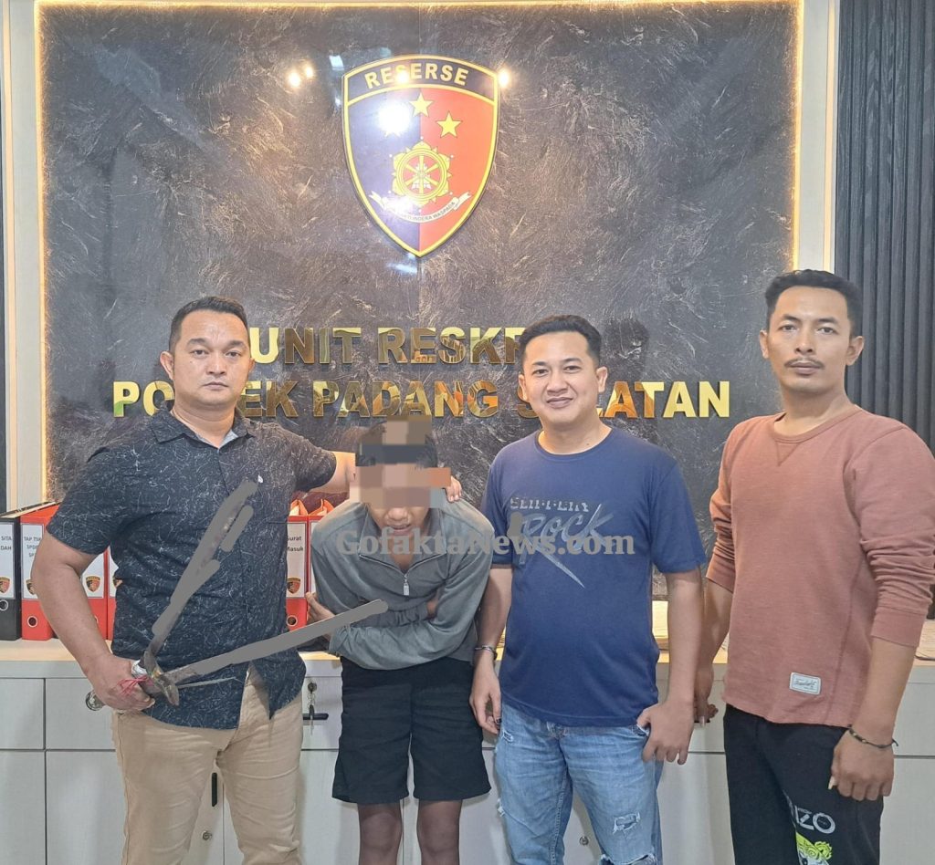 PADANG|GofaktaNews.com–Jajaran Kepolisian Sektor (Polsek) Padang Selatan berhasil mengamankan seorang pria berinisial J (35) yang diduga melakukan tindak pidana pengancaman menggunakan senjata tajam jenis pedang. Pelaku ditangkap pada hari Kamis, 24 Juli 2025, sekitar pukul 16.00 WIB, di kawasan Kampung Batu, Kelurahan Batang Arau, Kecamatan Padang Selatan, Kota Padang.
