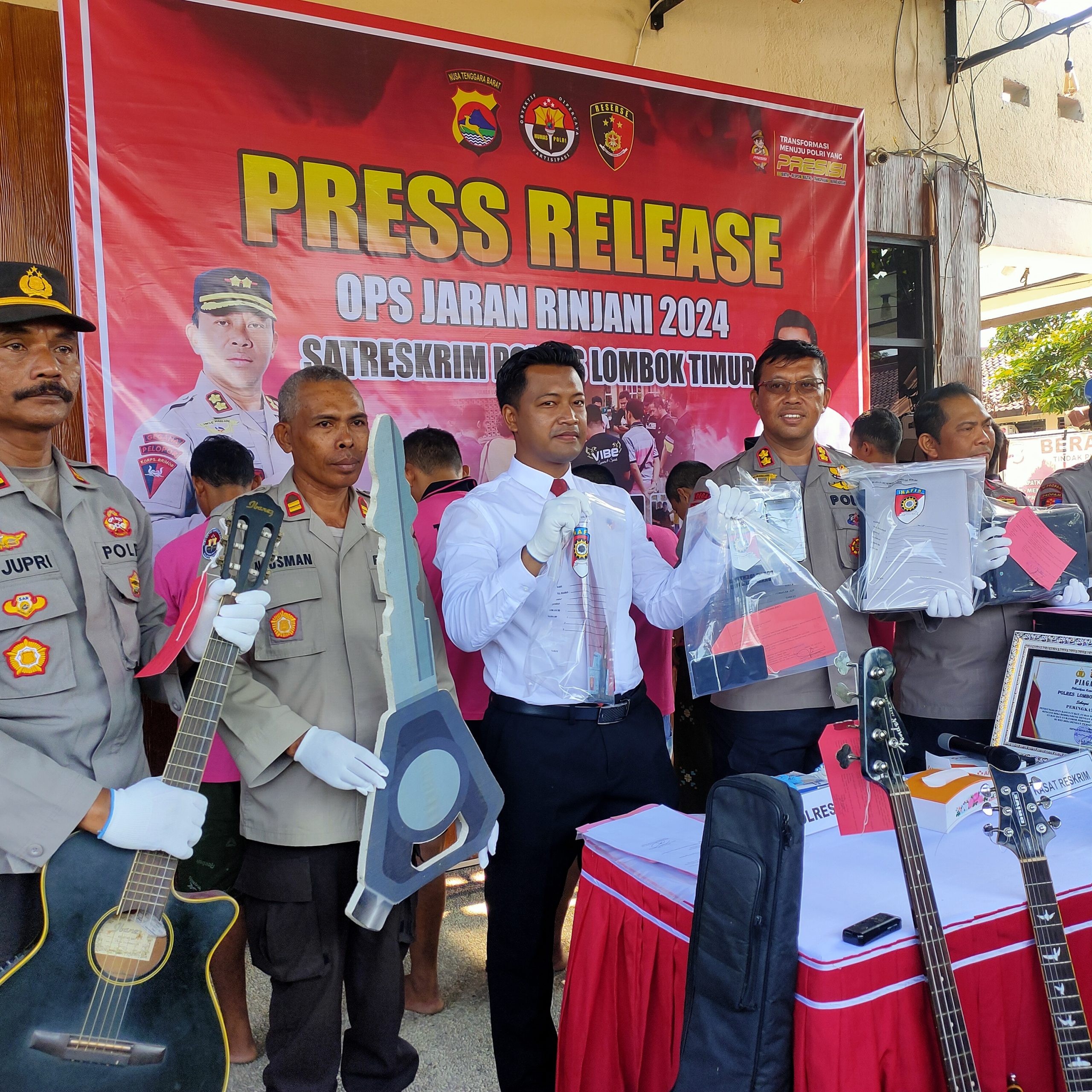 Dari hasil oprasi Jaran Rinjani 2024 ini berhasil diamankan sebanyak 298 Barang Bukti (BB) terdiri atas 29 unit sepeda motor, 2 unit mobil, 8 unit elektronik, 19 unit HP, 3 unit mesin perahu, 221 lain seperti set alat Narkoba, tong gas, Gitar,Kartu Identitas,Ayam, sapi, buah alpukat, dan Konci liter T.