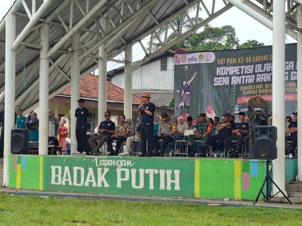 Camat Cariu, Agus Sopyan Budi Asmara, S. KM, S. IP, M. AP, secara resmi membuka kegiatan Semarak HUT PGRI Ke-80 Cabang Cariu dengan memukul gong. Simbolisasi ini menandai dimulainya rangkaian perlombaan dan kegiatan yang telah dipersiapkan. Kapolsek Cariu turut hadir dan melakukan pelepasan balon HUT PGRI Ke-80, menambah semarak suasana pembukaan.