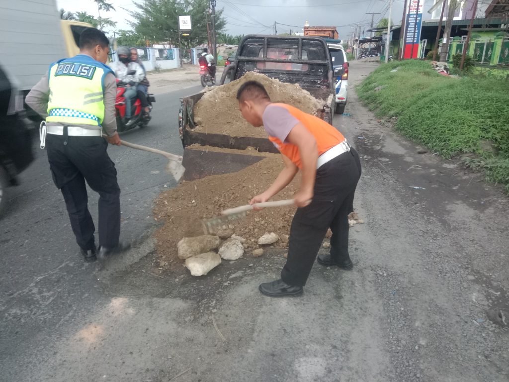 Personil Sat Lantas Polres Batu Bara yang terlibat dalam kegiatan ini adalah AIPDA BUSDANIL, BRIPKA BAYU, dan BRIPKA MAJU. Mereka melakukan penimbunan jalan berlubang dengan menggunakan material yang sesuai untuk mengisi lubang-lubang yang ada di jalan.