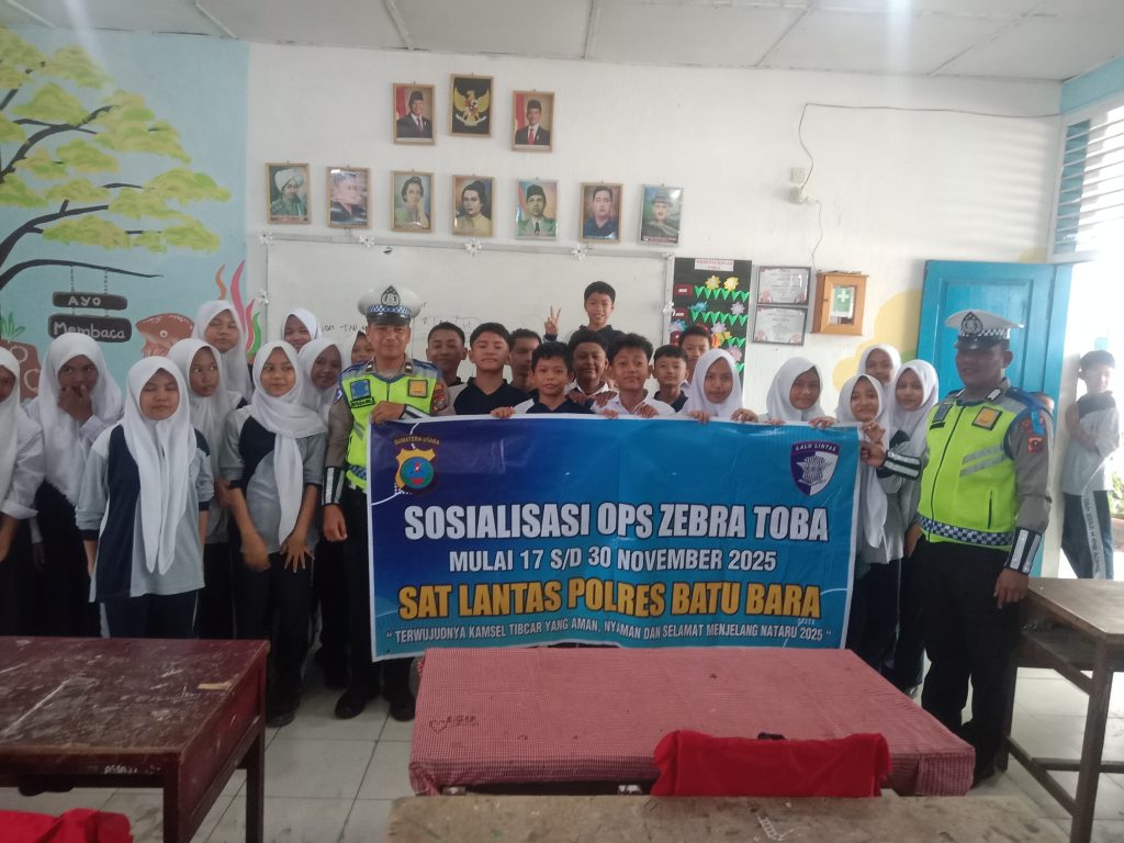 Personil Sat Lantas Polres Batu Bara, AIPDA BUSDANIL, BRIPKA BAYU RITONGA, dan BRIPKA MAJU HUTAGAOL, melaksanakan kegiatan sosialisasi Operasi Zebra Toba 2025 di SMP Negeri 1 Air Putih, Senin (24/11/2025).