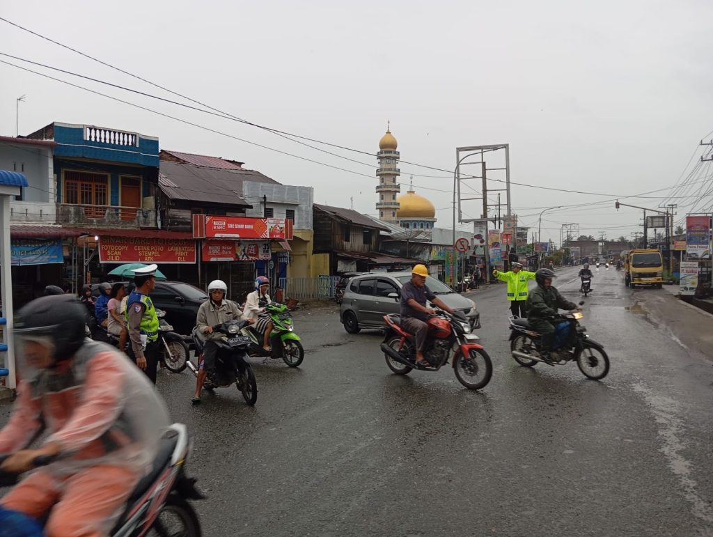Cuaca saat itu hujan ringan, namun personil Sat Lantas Polres Batu Bara tetap melaksanakan tugas dengan baik.