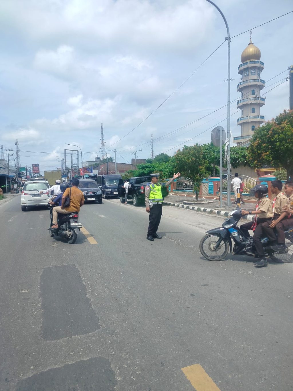 Personil Sat Lantas Polres Batu Bara yang dipimpin oleh Kasat Lantas Polres Batu Bara, AKP SIMON E. SIMATUPANG, S.H., M.H., melakukan pengaturan lalu lintas di sekitar mesjid untuk mencegah kemacetan dan kecelakaan lalu lintas.