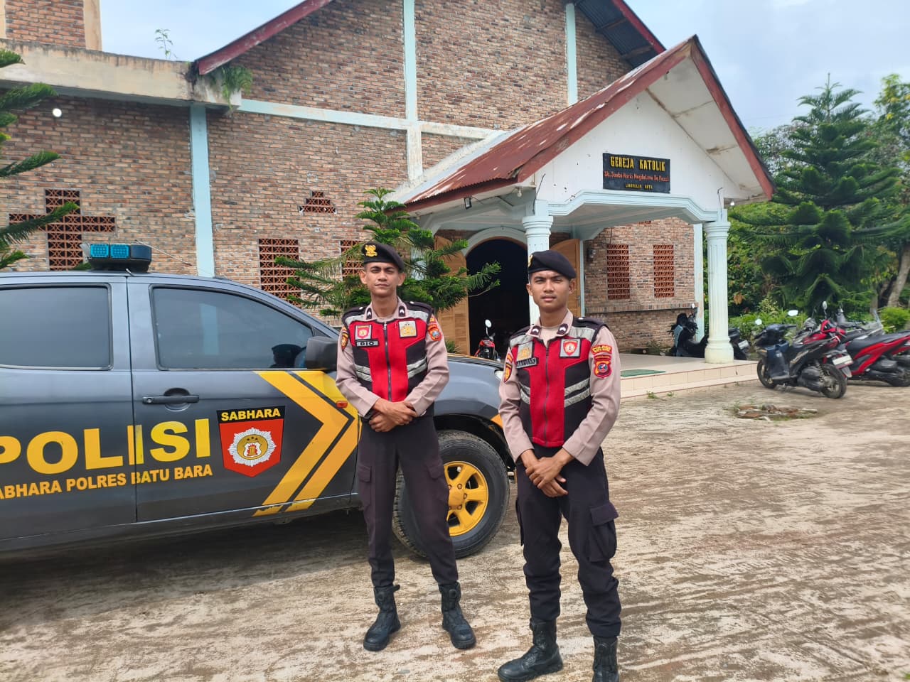 Personil Sat Sabhara Polres Batu Bara melakukan patroli dan pengamanan gereja-gereja di wilayah hukum Polres Batu Bara, Minggu (07/12/2025) pukul 11.00 WIB.