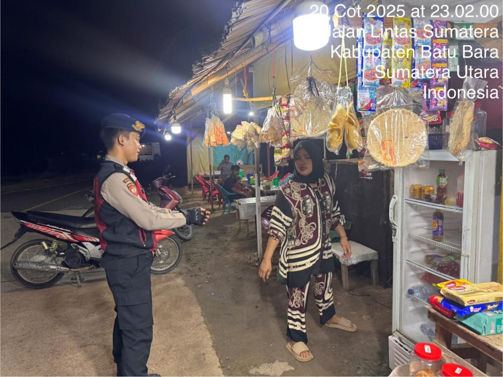 Satuan Samapta Polres Batu Bara melaksanakan kegiatan Cooling System dengan memberikan himbauan dan pesan Kamtibmas kepada masyarakat di Kedai Ibu Baron. Kegiatan ini dilaksanakan pada Senin (20/10/2025) pukul 23.00 WIB hingga selesai.