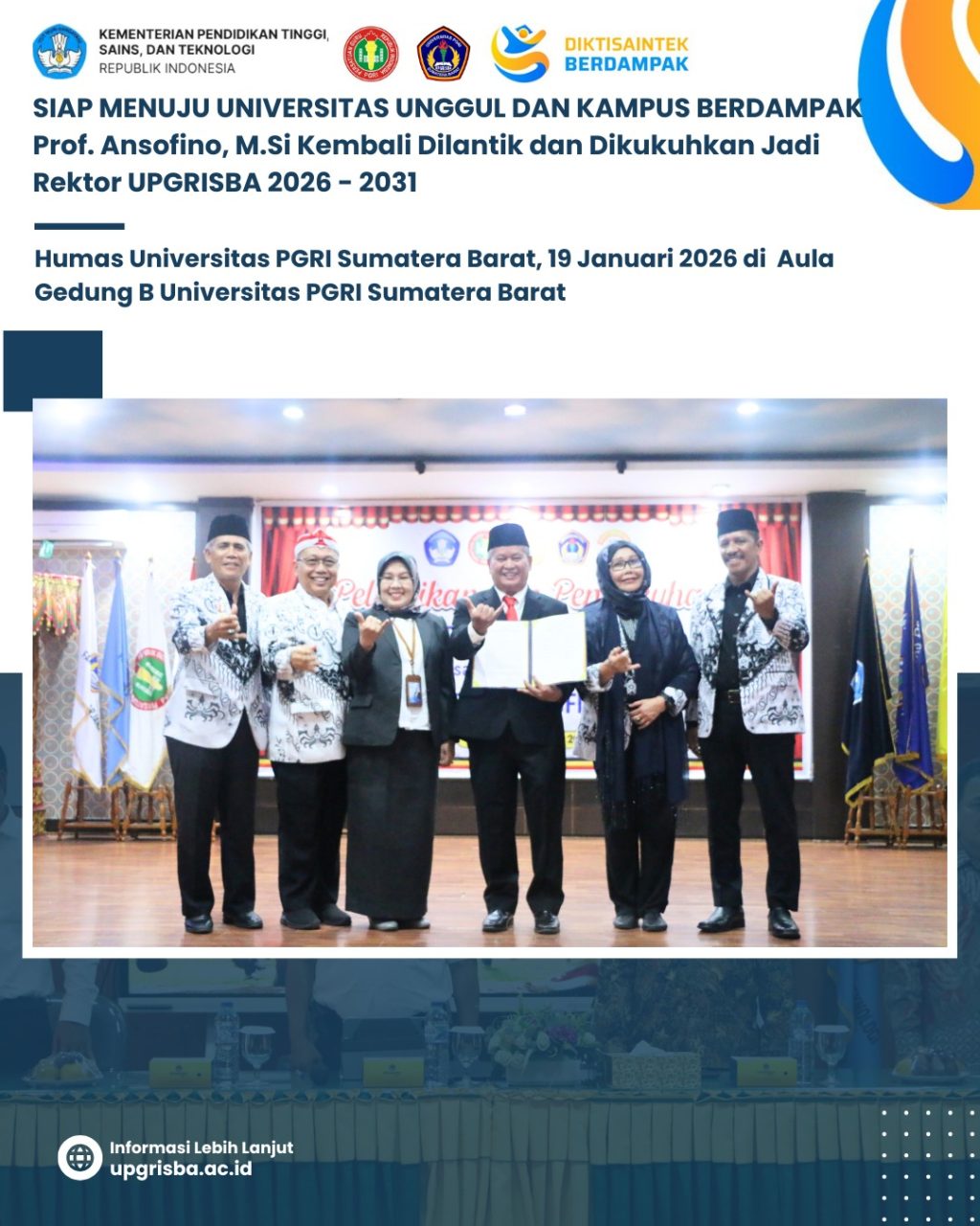 PADANG – Bapak Prof. Dr. Ansofino, M.Si. kembali dilantik dan dikukuhkan sebagai Rektor Universitas PGRI Sumatera Barat (UPGRISBA) untuk masa jabatan 2026–2031. Pelantikan tersebut dilaksanakan berdasarkan Surat Keputusan Pengurus Besar Persatuan Guru Republik Indonesia (PB PGRI) Nomor 86/Kep/PB/22/2025.