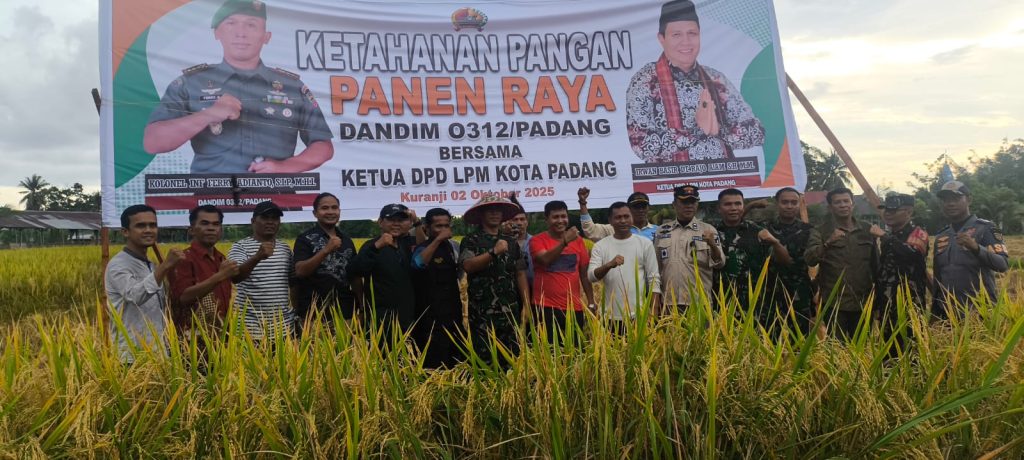 PADANG|Detik24jam.com– Komitmen mewujudkan ketahanan dan swasembada pangan ditunjukkan melalui kolaborasi erat antara TNI dan masyarakat di Kota Padang. Komandan Kodim (Dandim) 0312/Padang, Kolonel Inf Ferry Adianto, S.I.P., M.H.I., serta Pasipers Kodim 0312/ Padang Mayor Caj Rasul hamidi, bersama Ketua DPD Lembaga Pemberdayaan Masyarakat (LPM) Kota Padang, Irwan Basir Dt. Rajo Alam, S.H., M.M., Kabid Ops Perhubungan Kota Padang Malizar Ade, Lurah Kuranji Syafrizal, Lurah lolong Belanti Eripon, Ketua PPM Kota Padang Yaldi Chaniago,Sekretaris Karang Taruna Kota Padang Hendratmo Supanji, Tokoh Masyarakat Kota Padang,Pengurus DPD LPM Kota Padang, Dubalang Kota Padang, RT ,RW se-Kelurahan Kuranji, Ninik mamak,bundo kandung,alim ulama cadiak pandai dan masyarakat Kuranji melakukan kegiatan Panen Raya Ketahanan Pangan pada Kamis (2/10/2025).