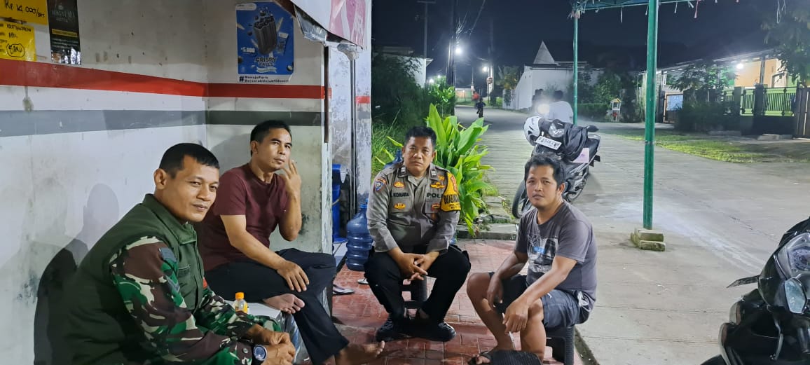 Bhabinkamtibmas melaksanakan dialog dengan petugas ronda malam Kp.Pasar Rebo RT.001/008 Desa Cihideung Udik yang sedang melaksanakan ronda malam,