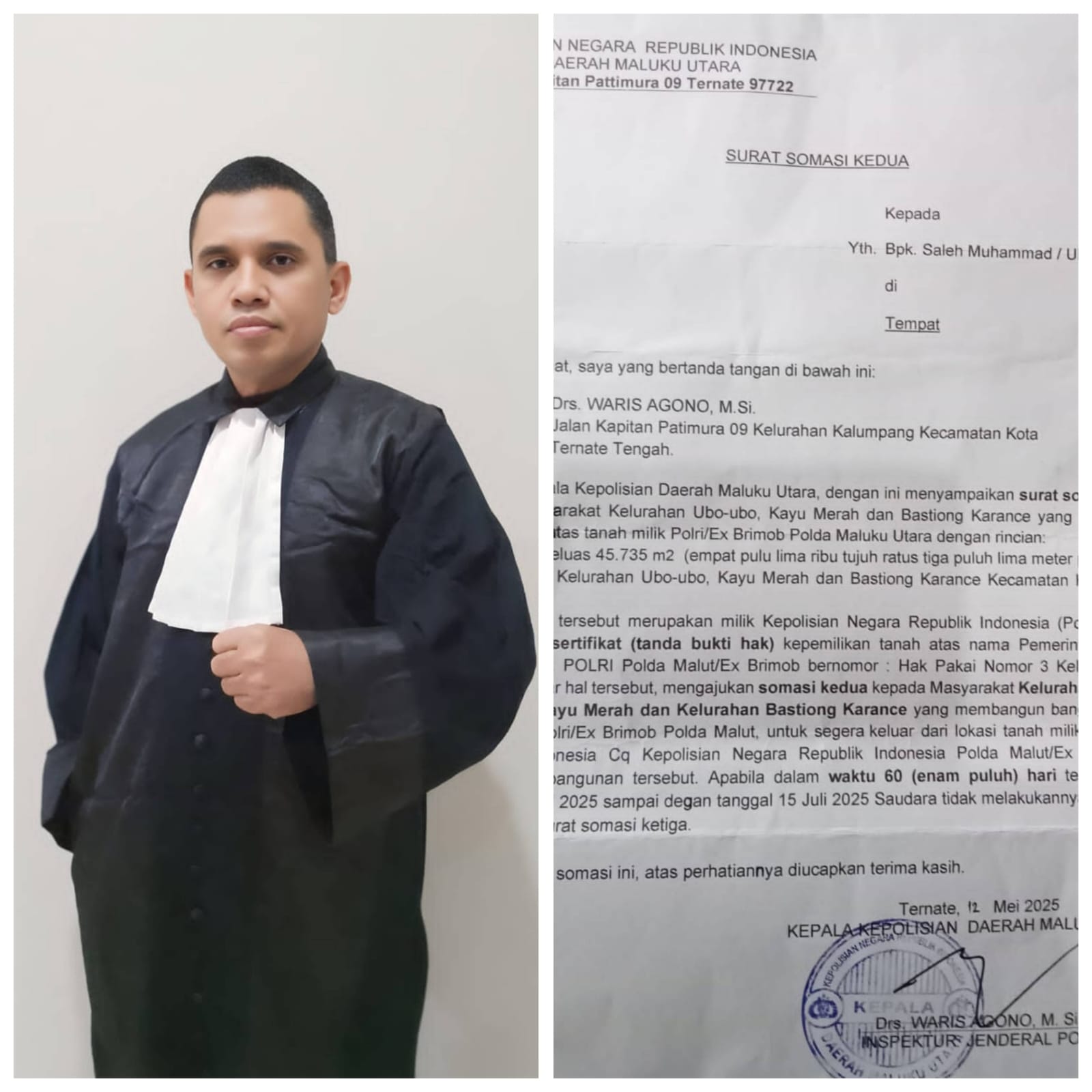 Ternate, – Surat somasi kedua yang dilayangkan Kapolda Maluku Utara terhadap warga di tiga kelurahan (Ubo-ubo, Kayu Merah, dan Bastiong Karance) terkait sengketa tanah seluas 45.735 m² memantik kritik tajam dari praktisi hukum. Surat bernomor Hak Pakai 3 Kelurahan Ubo-ubo itu dinilai bermasalah secara hukum, terutama karena salah satu pihak yang disomasi, Saleh Muhammad, dilaporkan telah meninggal dunia beberapa tahun lalu.