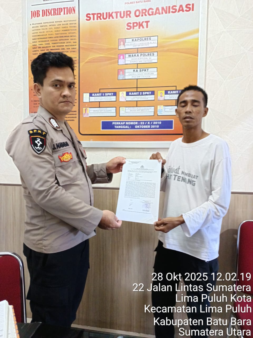 Setelah menerima laporan, personil Piket SPKT Polres Batu Bara memberikan surat tanda bukti laporan polisi (STTLP) kepada pelapor sebagai bukti bahwa laporan telah diterima dan sedang diproses.