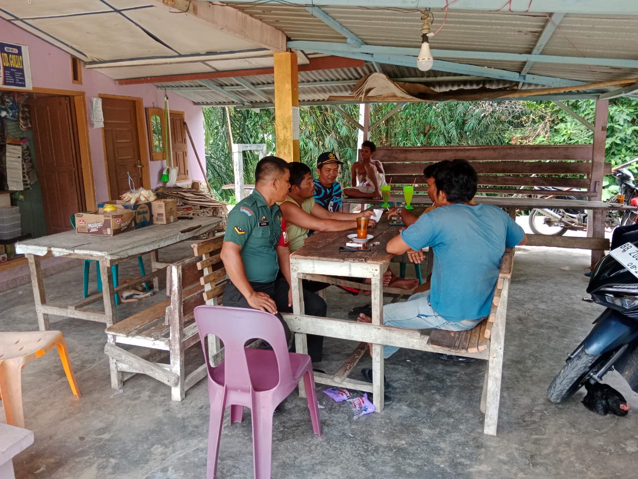 TAPTENG_Dalam membina kebersamaan dengan warga binaan, Serda Rudiantoni Zega. melaksanakan kegiatan Komunikasi Sosial (Komsos). Bertempat di salah satu warung, yang berlokasi di Desa Madani. Kecamatan.Sorkam.Barat.Kabupaten Tapanuli Tengah.